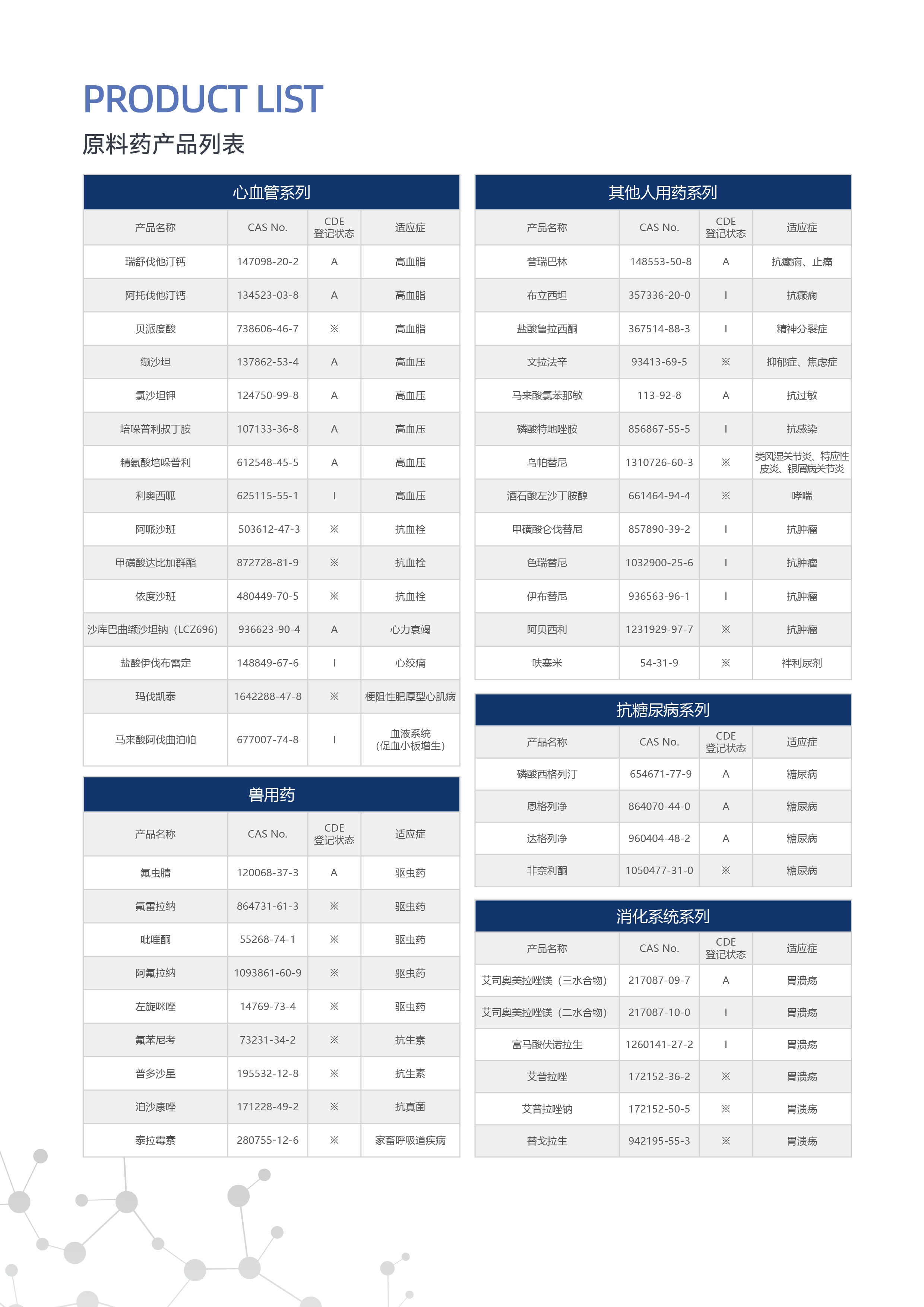 | API | Product Name 产品名称 | CAS No. | Structure 结构式 | Patent 专利号 |