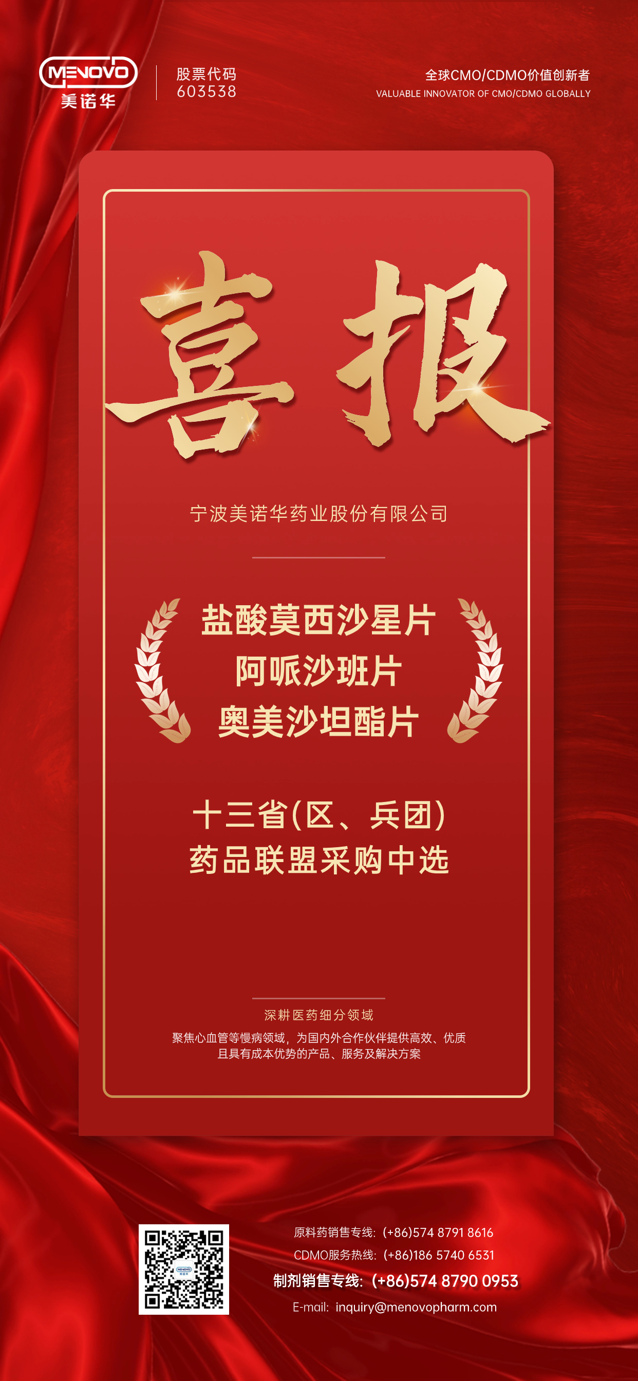 近日,美诺华3款产品(盐酸莫西沙星片、阿哌沙班片、奥美沙坦酯片)中选十三省(区、兵团)药品联盟采购。